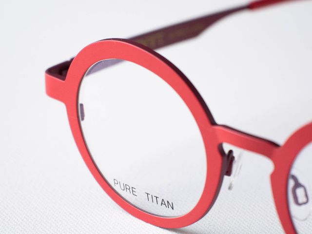 パッと目を引く鮮やかな赤色の丸眼鏡です。